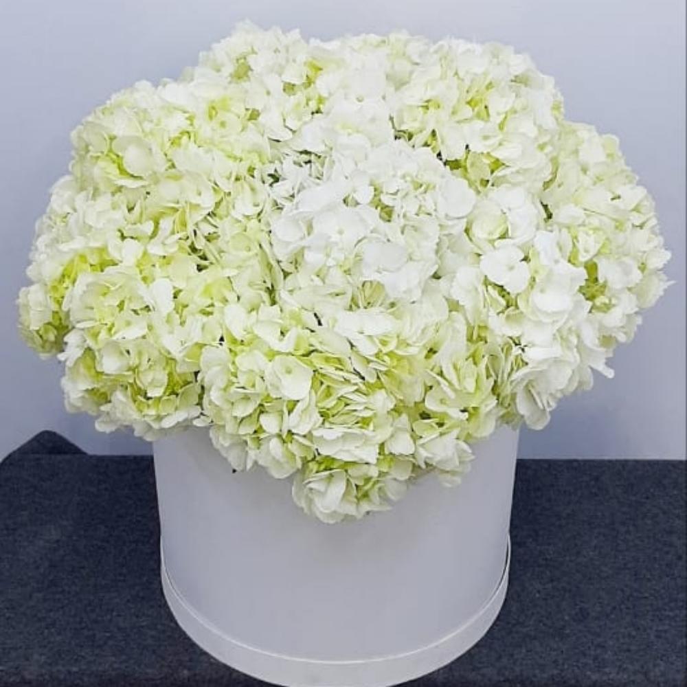 белые гортензии – 15 шт.коробка шляпная большая белая – 1 шт.