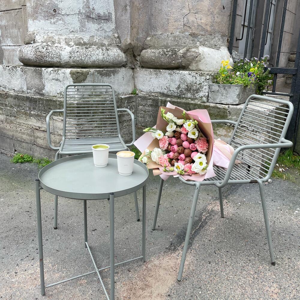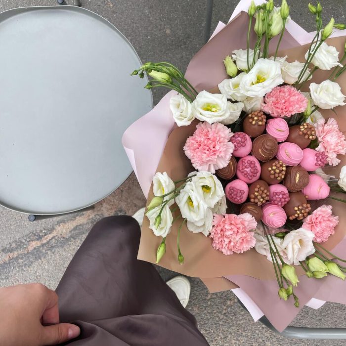 эустома белая – 6 шт.диантус нежно розовый – 5 шт.свежая клубника в бельгийском шоколаде – 450 гр.
