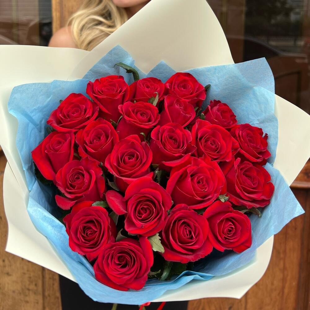 Роза Эквадор 60 см – 21 шт.Дизайнерская упаковка – 3 шт.Лента атласная – 2 шт.