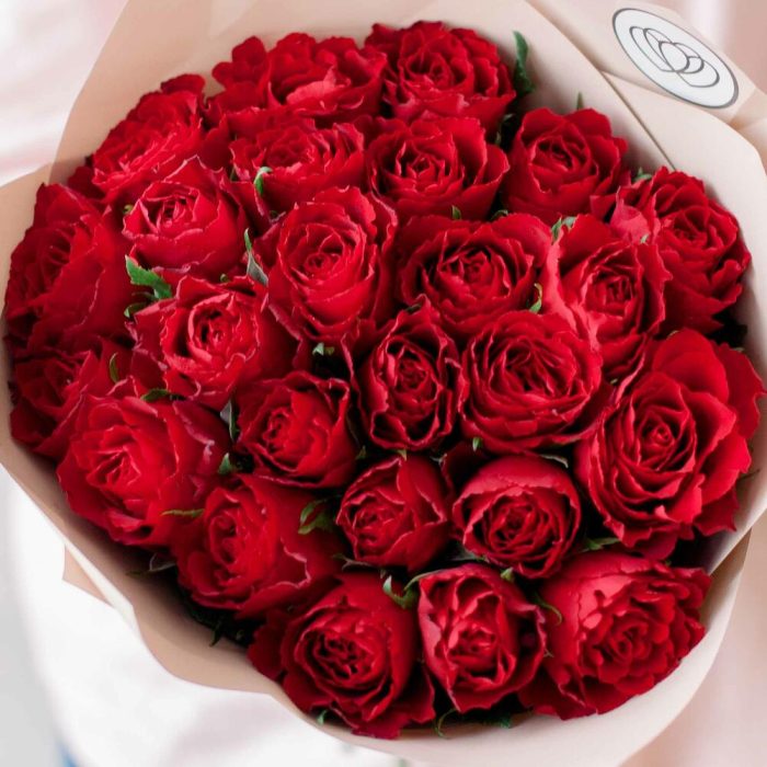 Букет из 25 красных роз (Кения) 40 см в кремовой пленке