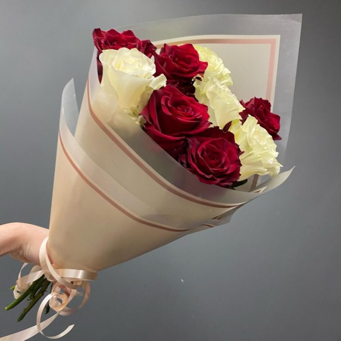 Роза – 9 шт.Упаковка дизайнерская – 2 шт.Лента атласная – 1 шт.