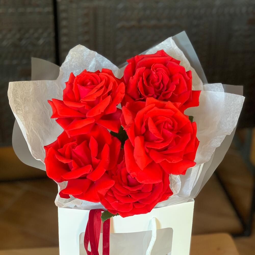 Роза французская – 5 шт.Упаковка дизайнерская – 1 шт.пакет с прозрачным окном – 1 шт.лента текстильная – 2 шт.