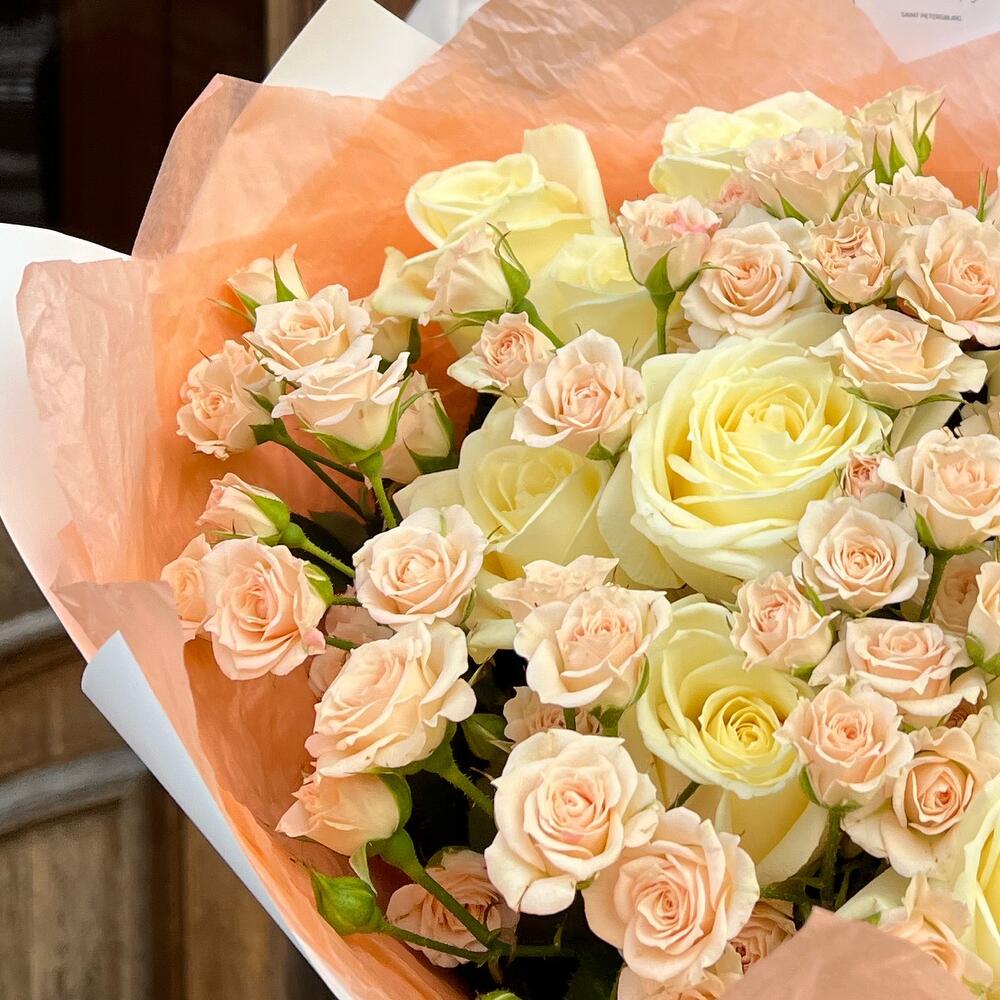 Роза кустовая 60 см – 10 шт.Роза одноголовая 60 см – 11 шт.Дизайнерская упаковка – 3 шт.Тишью – 1 шт.Лента атласная – 2 шт.