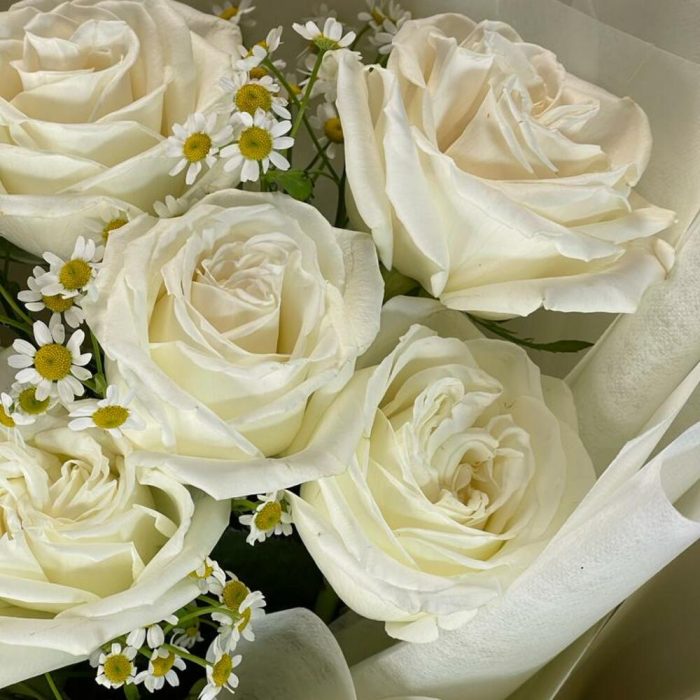 Лента – 2 шт.Роза – 7 шт.Матрикария – 5 шт.бумага упаковочная – 2 шт.