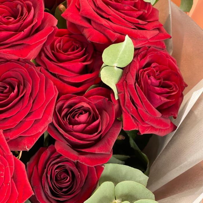 Лента – 2 шт.Эвкалипт – 2 шт.Упаковка – 2 шт.Роза наоми – 19 шт.