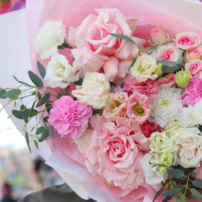 Лизиантус – 4 шт.Роза кустовая – 1 шт.Хризантема кустовая – 1 шт.Эвкалипт – 1 шт.Гвоздика – 3 шт.Сантини – 1 шт.Роза белая пионовидная – 3 шт.Французская роза – 3 шт.Открыточка с вашими пожеланиями – 1 шт.Шоколадка – 1 шт.Дизайнерская упаковка – 1 шт.подкормка для срезанных цветов – 1 шт.инструкция по уходу за цветами – 1 шт.