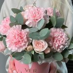 Кустовая роза – 3 шт.Диантус – 6 шт.Коробка – 1 шт.Оазис флористический – 1 шт.