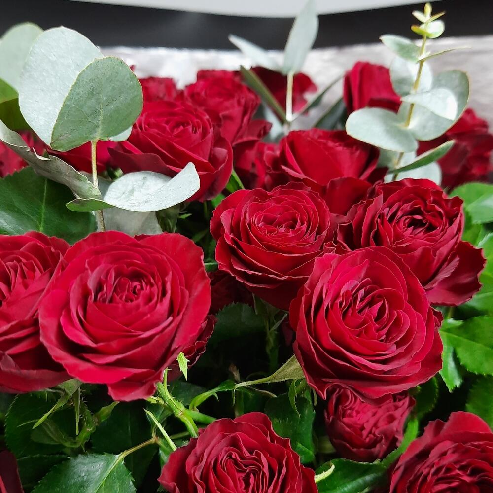 Эвкалипт – 2 шт.Упаковка дизайнерская – 2 шт.Роза кустовая 60 см – 10 шт.