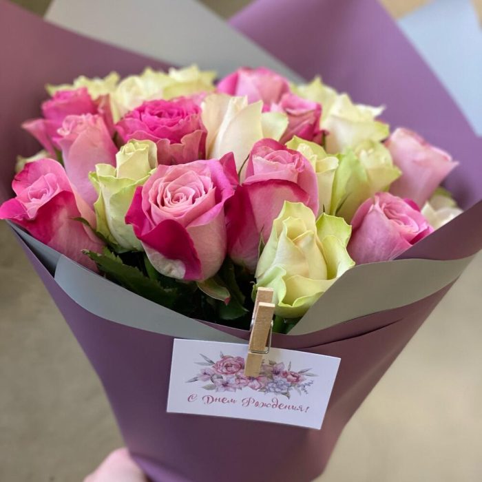 Лента атласная – 1 шт.Упаковка дизайнерская – 2 шт.роза кения – 19 шт.