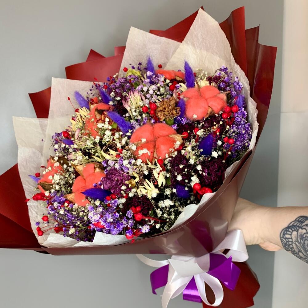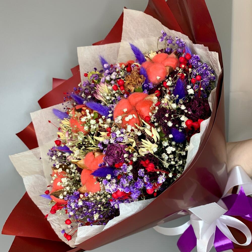Хлопок – 7 шт.Лента атласная – 3 шт.Тишью – 2 шт.Лагурус (сухоцвет) – 15 шт.Дизайнерская упаковка – 4 шт.гипсофила сухоцвет – 15 шт.цветы сухоцветы – 25 шт.абрус сухоцвет – 30 шт.