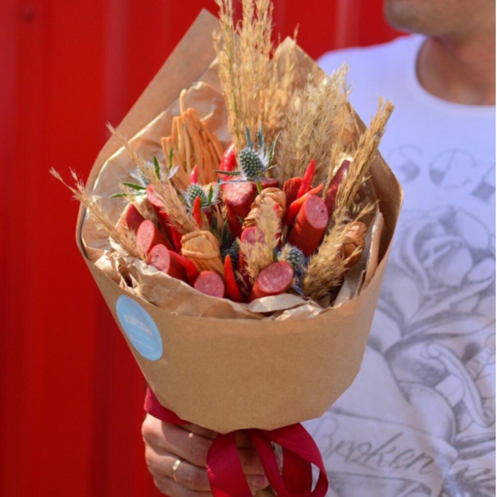 Колбаски охотничьи – 15 шт.Сыр косичка – 4 шт.перец чили упаковка – 1 шт.эрингиум сухоцвет – 1 шт.пампасная трава (сухоцвет) – 2 шт.Упаковка крафт – 1 шт.Лента атласная – 1 шт.